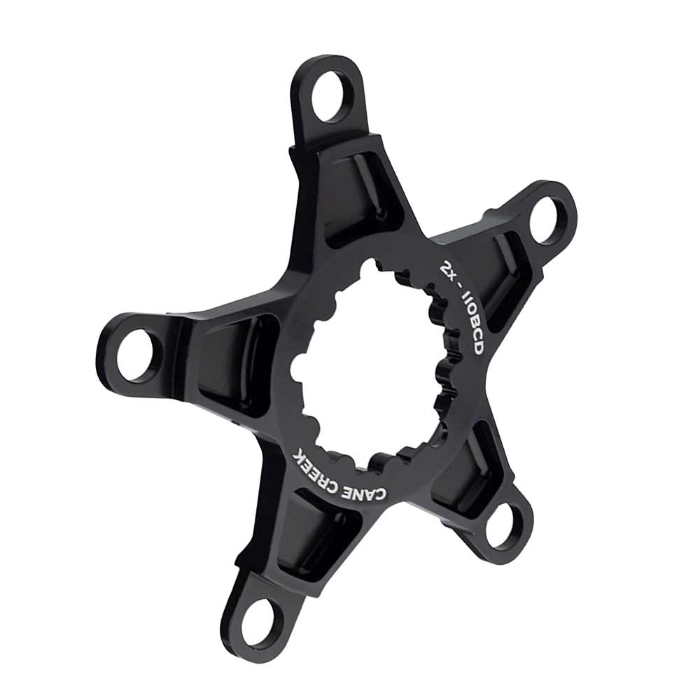 Der Spider zur Montage von 1 oder 2 Kettenblaettern an den Cane Creek eeWings All-Road und MTB Kurbelarmen. Bei der Montage von einem Kettenblatt haben Sei dank des 110 mm Lochkreises eine deutlich groessere Auswahl als bei den Direct Mount Kettenblaettern. Durch die Montage von 2 Kettenblaettern koennen Sie sowohl klassischen Rennraduebersetzungen als auch Gravel Uebersetzungen realisieren. Die 2 fach Abstufung ist kompatibel mit 10 und 11 fach Schaltungen. Als kleinstes Kettenblatt erlaubt der 110 er Lochkreis ein 32 Kettenblatt.