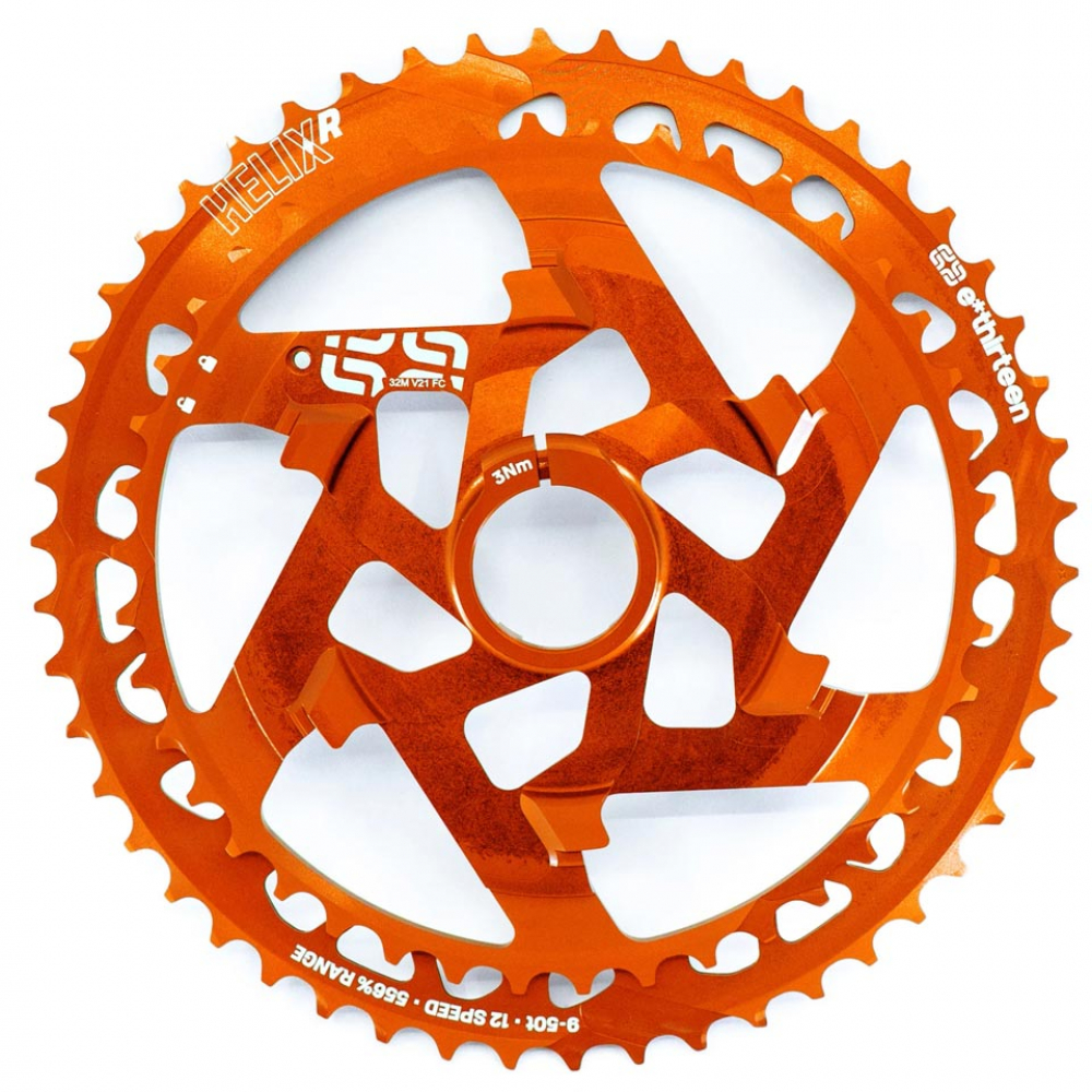 Die neue ethirteen Helix Race 12 fach Kassette fuer den Marathon und Race Einsatz Einsatz jetzt mit 556 Prozent Uebersetzungsbandbreite und nur 350 Gramm Gewicht. Leichter als Sram XX1 oder Shimano XTR 12 fach Kassetten. Die grossen Ritzel sind aus Aluminium CNC-gefraest und der kleine Ritzelblock fuer bessere Haltbarkeit aus hitzebehandeltem Cromoly Stahl. Dadurch lassen sich beschaedigte oder verschlissene Kassettenteile austauschen, ohne die komplette Kassetteneinheit ersetzen zu muessen. Kompatibel mit den Sram XD Kassettenkoerpern und Shimano oder Sram 12 fach Schaltungen und Ketten, mit optimierter Schaltperformance