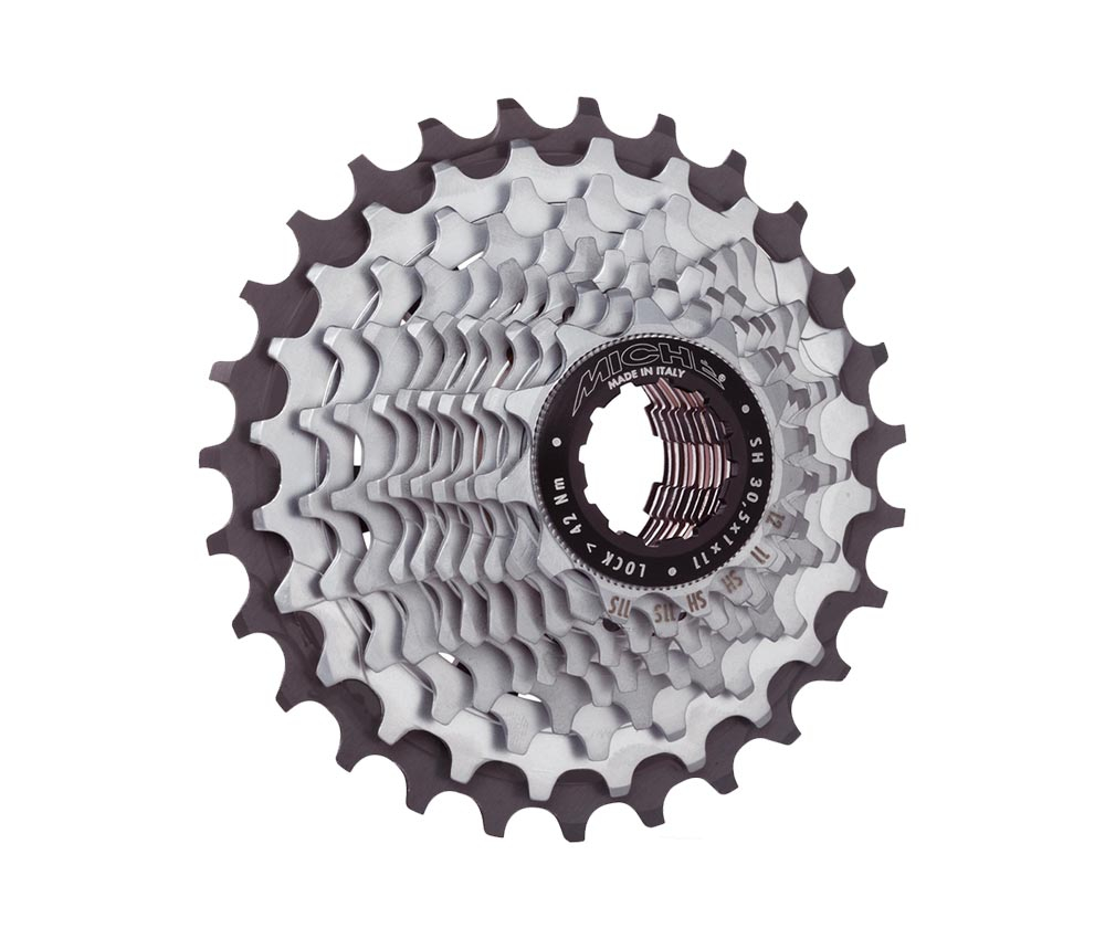 Leicht, haltbar und mit hervorragender Schaltperformance, der Miche Primato 11 SH Zahnkranz. Dank Stahl Ritzel leicht und verwindungssteif. Die Miche Schaltqualitaet basiert zu grossen Teilen auf der jahrzentelangen Zusammenarbeit mit Campagnolo. Die Letzte Ritzelposition und der Abschlussring bestehen aus AL 7075-T6 Aluminium, und ergeben eine Gewichtsersparnis von 12 Prozent.
